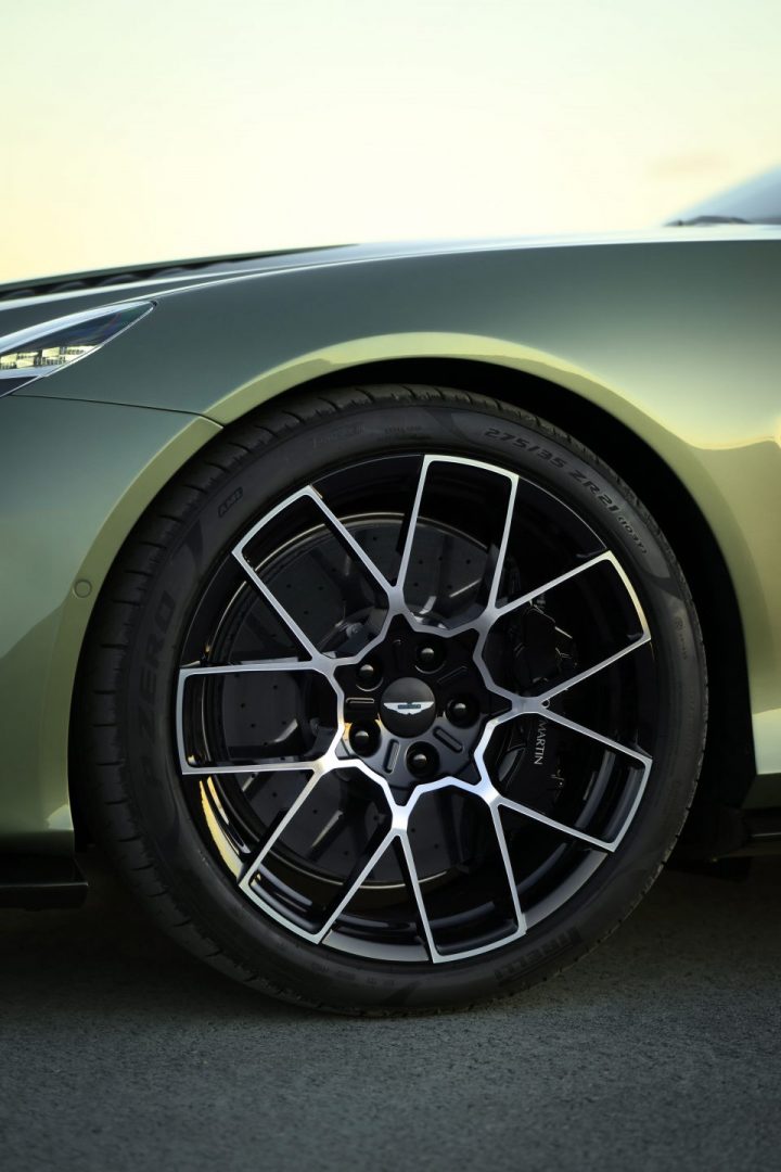 Um diese Kraft auf die Straße zu bringen, vertraut Aston Martin auf ein ZF-Achtgang-Automatikgetriebe, das auf der Hinterachse montiert ist – für eine optimale Gewichtsverteilung. Ein elektronisches Hinterachs-Differenzial (E-Diff) sorgt dafür, dass die Kraft in Millisekunden verteilt wird: vollständig offen oder zu 100 Prozent gesperrt – je nach Fahrsituation.