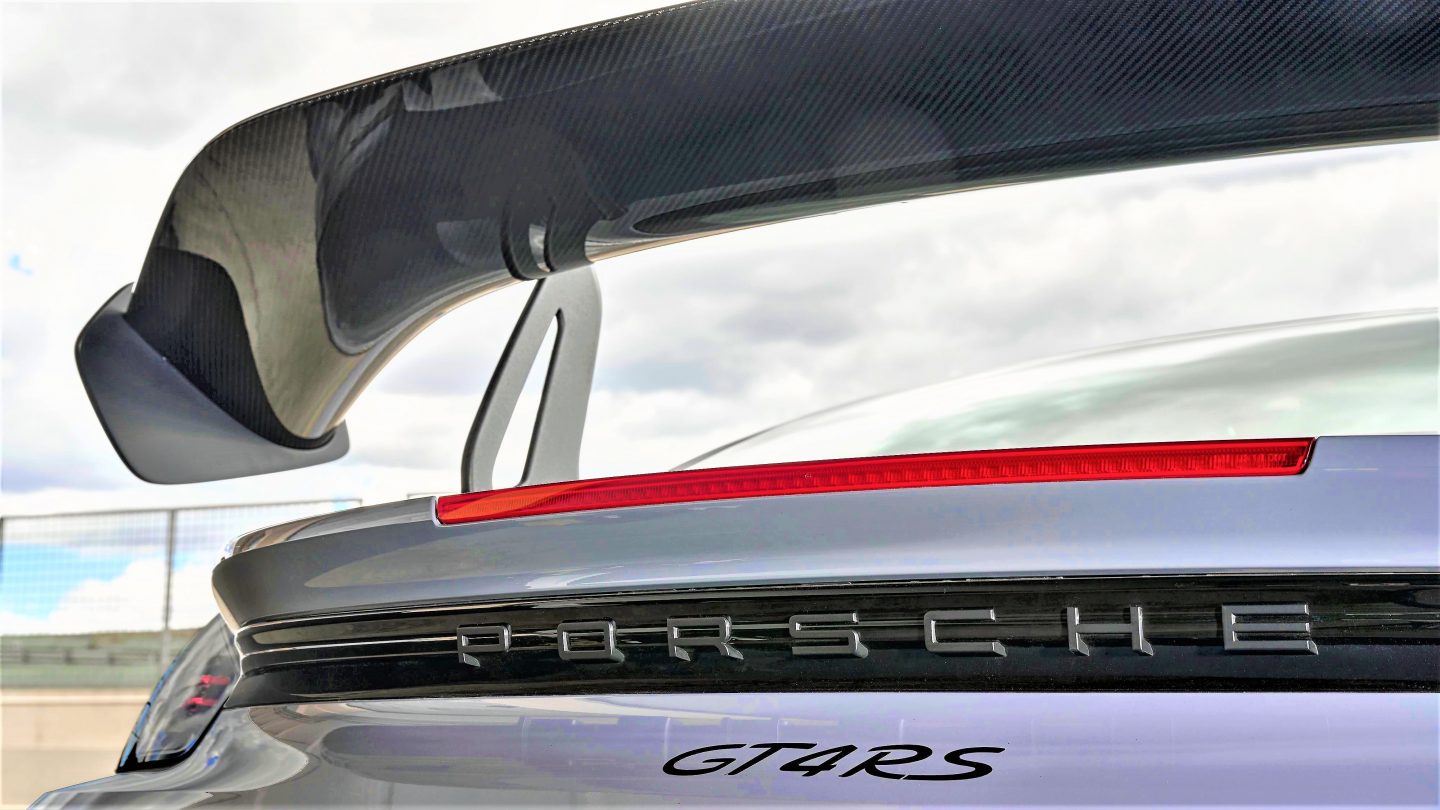 Einen markanten Unterschied im Außendesign macht der neue, feststehende Heckflügel mit Schwanenhalsanbindung und Flügelstützen aus Aluminium. Dieses besonders effiziente Flügelprinzip ist vom GT-Rennwagen Porsche 911 RSR abgeleitet und fand beim 911 GT3 erstmals Eingang in ein Porsche-Serienfahrzeug. In Kombination mit der im Vergleich zum 718 Cayman um 30 Millimeter abgesenkten Karosserie, den auffälligen Entlüftungen der vorderen Radhäuser, der aerodynamisch optimierten Unterbodenverkleidung mit anschließendem Heckdiffusor, dem mehrfach einstellbaren Frontdiffusor und der neuen Buglippe mit umströmten Sideblades generiert der 718 Cayman GT4 RS in der Performance-Stellung, die dem Einsatz auf Rundstrecken vorbehalten ist, 25 Prozent mehr Abtrieb als der 718 Cayman GT4.