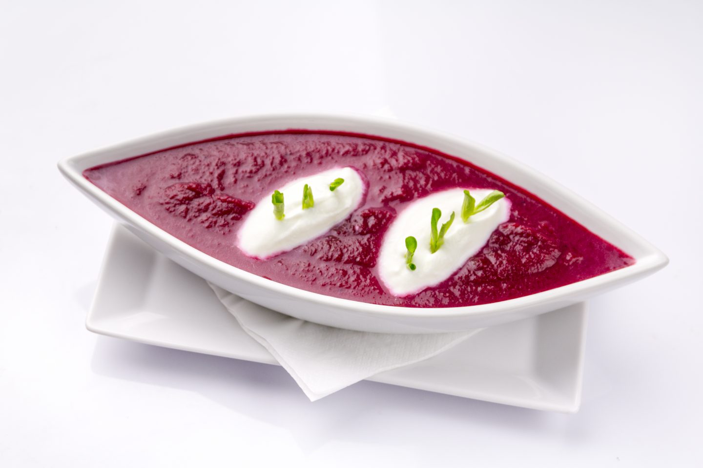Dieses kreative Gazpacho mit Roter Bete, Apfel und regionalen Kräutern wird leicht gekühlt serviert und modern interpretiert.