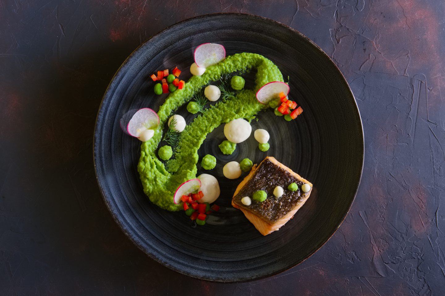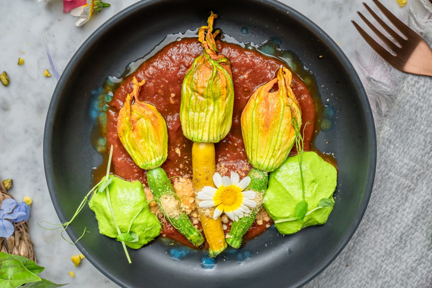 Auch Gemüse wird neu interpretiert: Blanchierte Minizuccinis mit ihrer Blüte liegen auf einer aromatischen Tomaten-Coulis, die durch fein gestoßene Pistazien zusätzlich Tiefe, Nussigkeit und Farbe erhält, begleitet von leuchtendem Erbsenpüree am Tellerrand. Gekrönt werden die zarten Blüten von grob gebröckeltem, gereiftem Manchego, der dem Gericht eine leicht salzige, kräftige Note verleiht. Ein vegetarisches Highlight, das Texturen, Farben und Aromen in perfekter Balance vereint und die Fusionsküche Jerez’ auf den Teller bringt.