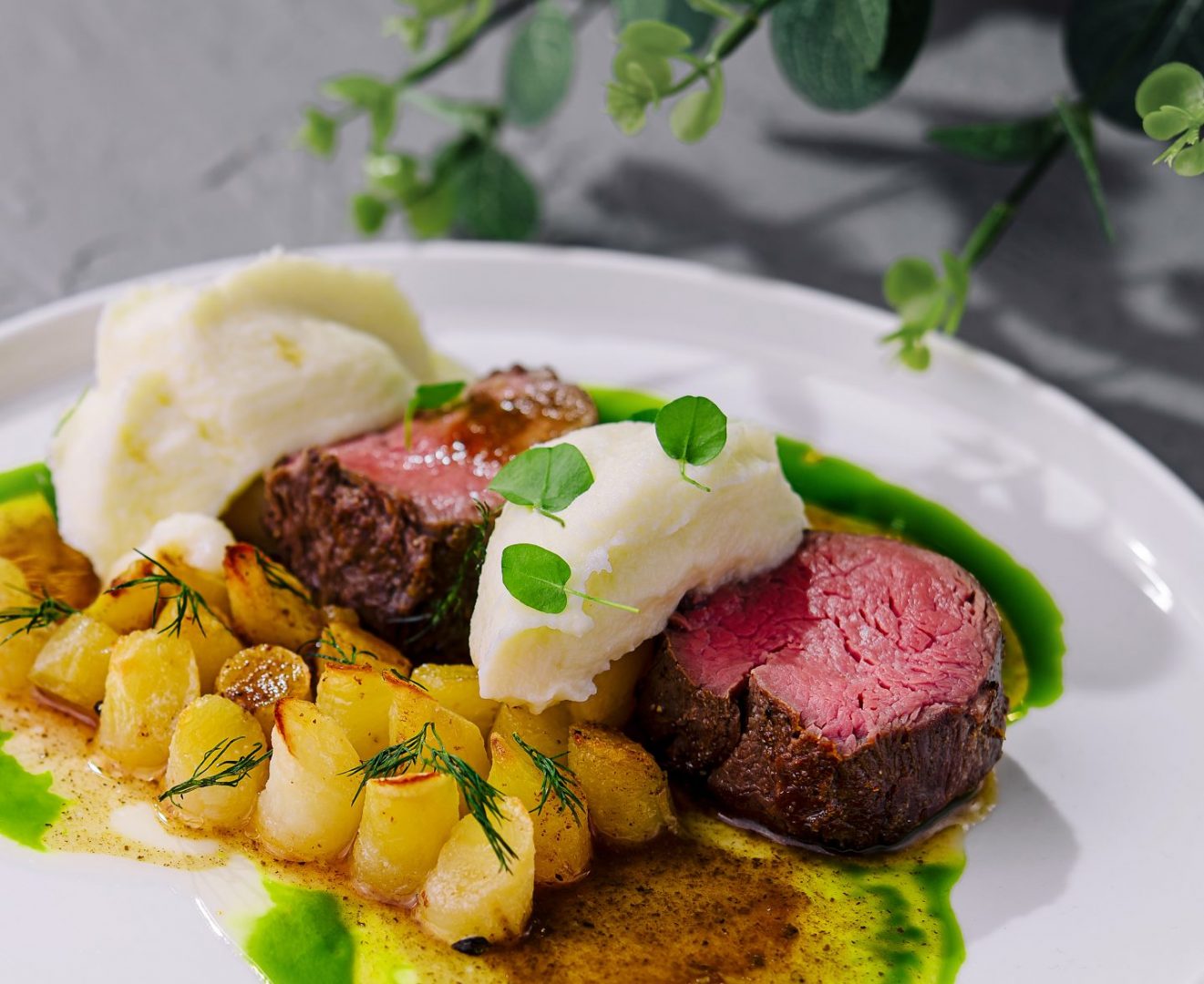 Junge Köche in Jerez zeigen eindrucksvoll, wie Tradition und Innovation verschmelzen können. So entstehen überraschende Gerichtsideen wie zarte Medaillons vom Rind auf den Teller, kurz und präzise angegrillt und serviert mit seidigen Kartoffelpüree, das durch einen Hauch Sellerie seine feine aromatische Tiefe erhält. Dazu gesellen sich leicht sautierte, tornierte Selleriestückchen, die mit ihrer dezenten Süße und Bissfestigkeit Struktur in das Gericht bringen. Vollendet wird die Komposition durch eine leuchtend grüne Kräuter-Sellerie-Emulsion aus Sellerieblättern, Petersilie und kaltgepresstem Olivenöl – ein frischer, moderner Kontrast, der die Zutaten hebt, ohne ihre Eleganz zu überlagern. Eine Fusion aus Präzision, regionaler Produktliebe und zeitgenössischer Kreativität.