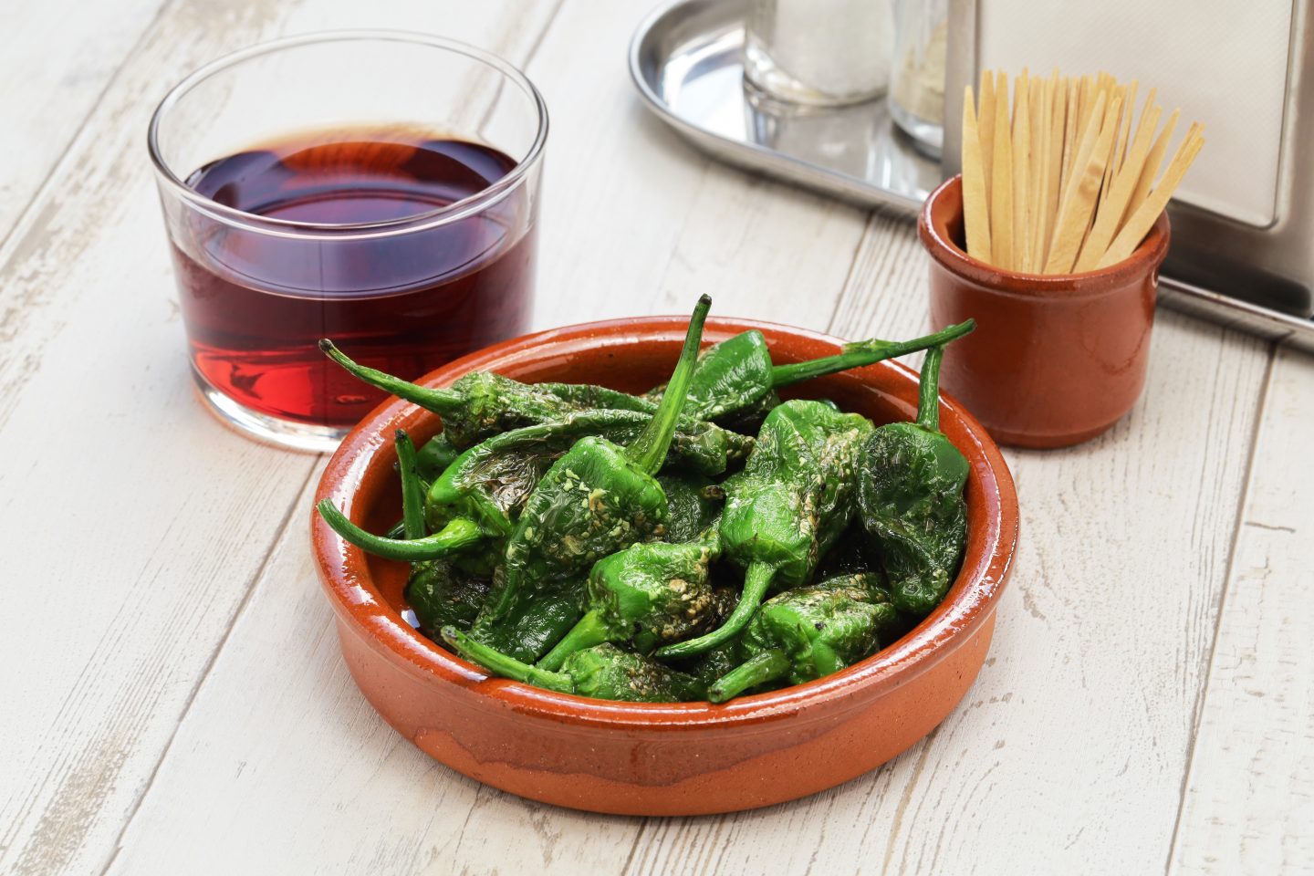 Pimientos de Padrón: auf der Karte stehen sie selten mit genauer Beschreibung; manche sind scharf, die meisten mild – das gemeinsame Probieren und Erraten ist Teil des Genusses.