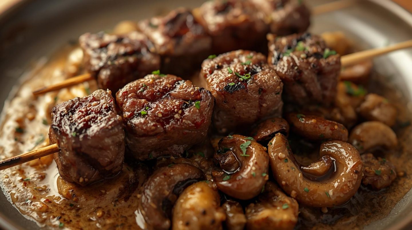 Auch Fleischliebhaber kommen auf ihre Kosten: Mini-Rinderfilet-Spieße begleitet von sautierten Pilzen in einer cremigen Cognac-Sahne-Sauce, verbindet die saftige Fleischqualität mit erdigen Aromen und einer feinen, samtigen Note.
