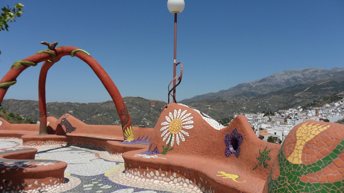 Nur wenige Meter entfernt stoßen wir auf einen Aussichtsplatz mit Blick auf Competa. Der Platz ist wunderschön gestaltet mit verschieden Mosaiken und Bildern, Sitzgelegenheiten und hervorragend geeignet für ein nettes Picknick.